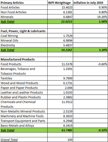 Here is the breakup of the WPI Index along with the inflation numbers for some select items for July.