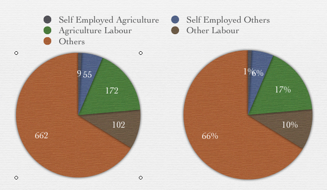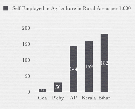 You can see that only 1% are self – employed in agriculture, and 7% are self – employed at all. The 1% self – employed in agriculture is the lowest among all states, with Pondicherry having the second lowest of 3% self – employed in agriculture.