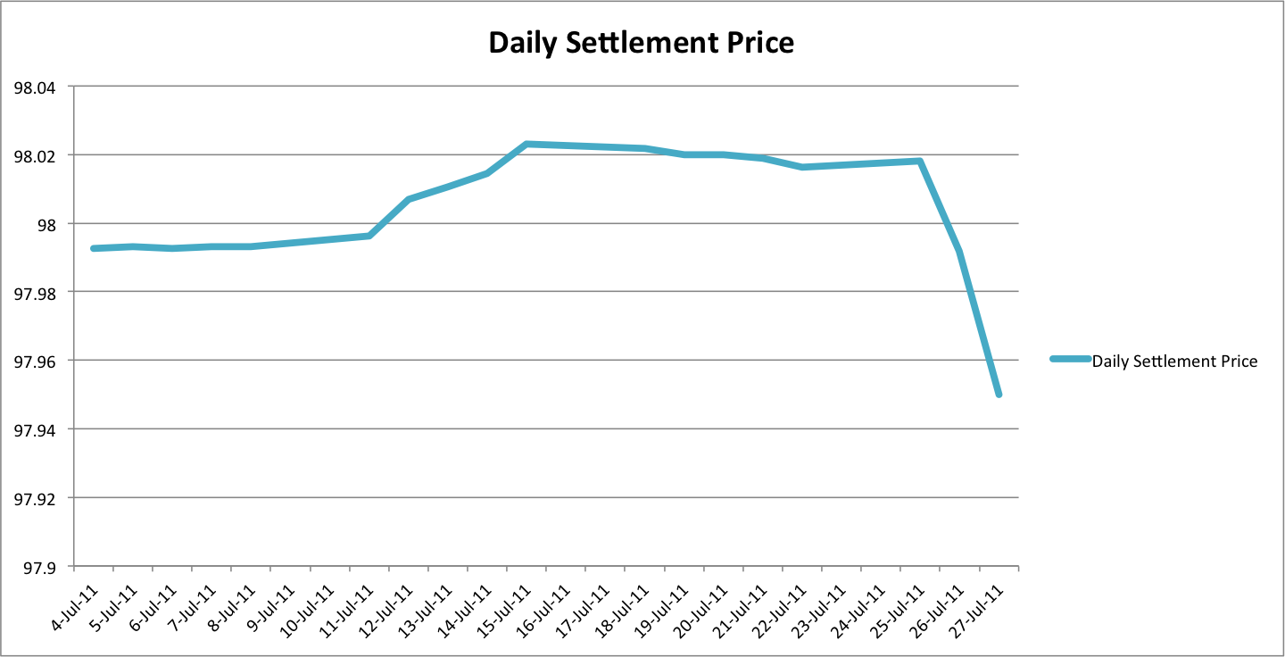 But, yield doesn’t move that much. Here is a chart of the daily settlement price movements of the 91DTB 270711