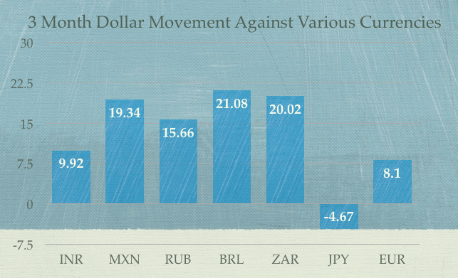 As you can see – except for the Japanese Yen, the US Dollar has risen up against every other currency in this chart, and that too by some significant percentages.