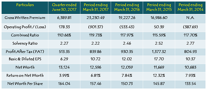 Combined Ratio stood at 119.73% (vs. 117.97% in FY 2015-16) and Solvency Ratio was at 2.22 times (vs. 2.46 times in FY 2015-16). Combined Ratio of 100 or above indicates that the company is incurring losses in its core insurance business. As far as Return on Net Worth (RoNW) is concerned, it has fallen from a high of 12.32% in FY 2014-15 to almost half at 6.81%.