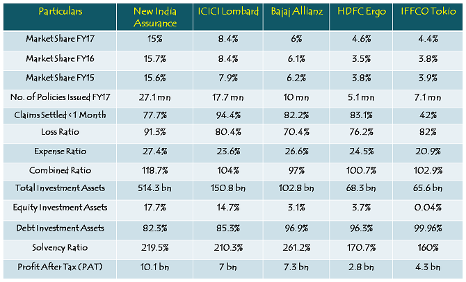 Recently listed ICICI Lombard is the only listed company with which we can compare NIA’s pricing and valuations, and NIA lags ICICI Lombard in almost all the parameters except Solvency Ratio. Firstly, NIA’s market share has declined from 15.6% in FY 2014-15 to 15% in FY 2016-17, whereas ICICI Lombard has been able to increase its pie from 7.9% in FY 2014-15 to 8.4% in FY 2016-17. HDFC Ergo and IFFCO Tokio too have gained on their respective market shares. Moreover, ICICI Lombard reported far better Combined Ratio (104%), Loss Ratio (80.4%) and Expense Ratio (23.6%) as compared to NIA for which these ratios stood at 118.7%, 91.3% and 27.4% respectively during the same period.