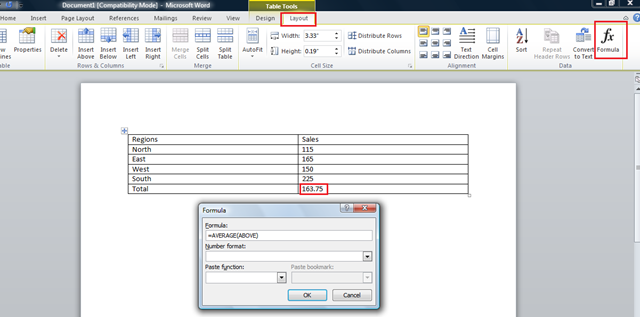 If you want to find average sales then place your cursor on the cell that you want to show the number at – click Layout –> Formula, and then type =AVERAGE(ABOVE), and hit enter. Word will calculate the average for you, and show the number on the cell.